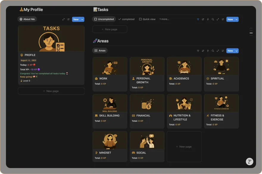 Unlike other templates that work in isolation, every OPTIMUS X template is interconnected. Complete a task in one area, and your global XP dashboard updates everywhere turning your entire life into a unified, motivating system.